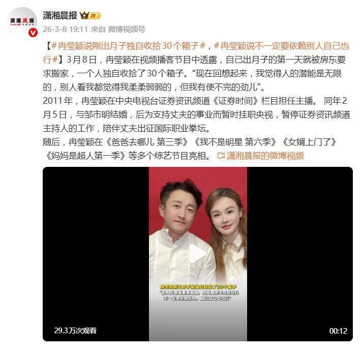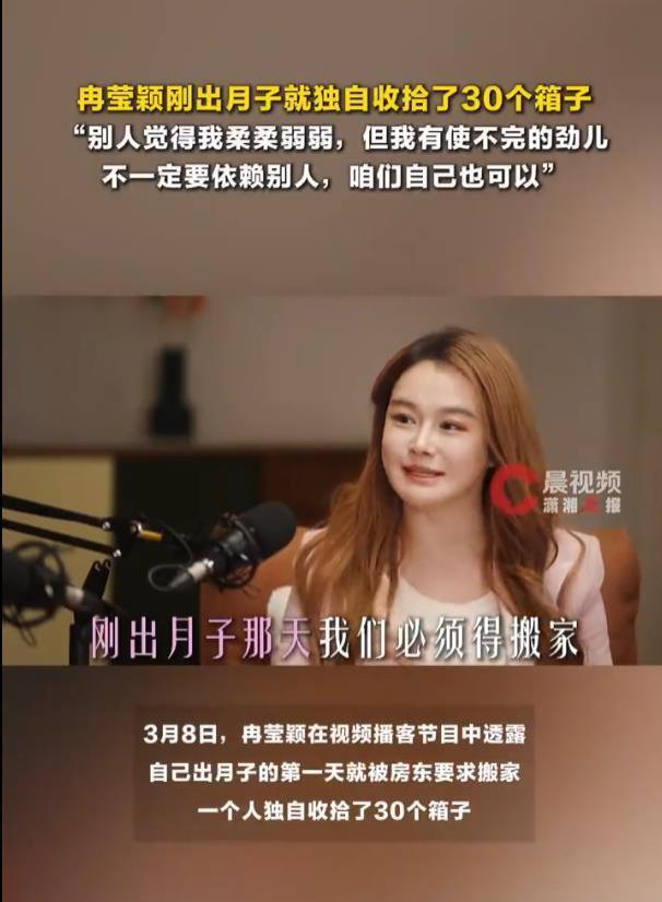 据 3 月 8 日晚间报说念,前央视主播、拳王邹市明的浑家冉莹颖在一档视频播客里爆出的经历,让不少网友直呼 " 太扎心 "。她裸露,我方刚生完孩子出月子的第一天,就接到房主因不毛售房而条件坐窝搬走的见知。更令东说念主不测的是,最终她一个东说念主打理打包了三十多个箱子,献艺了一出 " 月子姆妈极限搬家记 "。